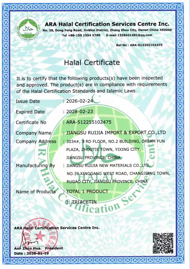 公司秉承“以质为本,以诚取信”的经营理念,具有完善的质量、环境、安全体系,通过ISO9001、ISO14001、ISO22000等体系认证。主要出口产品三乙酸甘油酯通过KOSHER、HALAL认证,完成了FDA和REACH的正式注册。